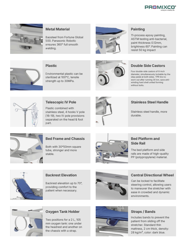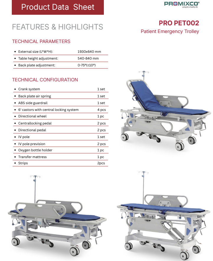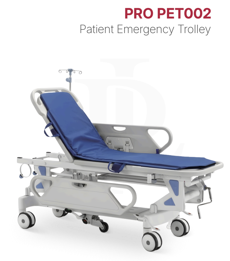 The PRO PET002 Patient Emergency Trolley is designed for modern hospital emergency and patient transfer needs. Built with high-quality materials, ergonomic design, and advanced mobility features, it ensures safety, comfort, and efficiency in critical care environments.